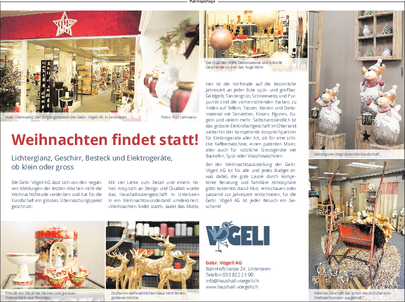In genau sechs Wochen ist Weihnachten. Wer nicht so lang warten möchte, findet bei der Gebrüder Vögeli AG in Unterseen bereits eine Menge Weihnachtsstimmung. Bereits zum siebten Mal in Folge arrangierte die Inhaberin Christine Vögeli eine bezaubernde Weihnachtsausstellung. Dutzende dekorative und festliche Artikel suchte Christine Vögeli in Kleinarbeit zusammen. (…)